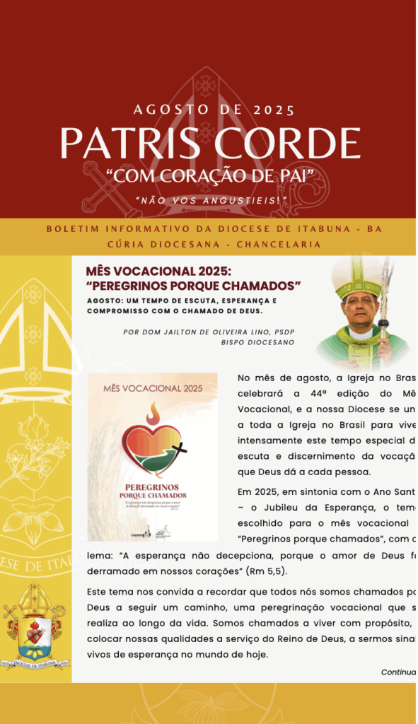 No mês de agosto, a lgreja no Bras celebrará a 44ª edição do Mê Vocacional, e a nossa Diocese se un a toda a Igreja no Brasil para vive intensamente este tempo especial d escuta e discernimento da vocaçã que Deus dá a cada pessoa. BAIXE E VEJA PATRIS CORDE – AGO 2025
