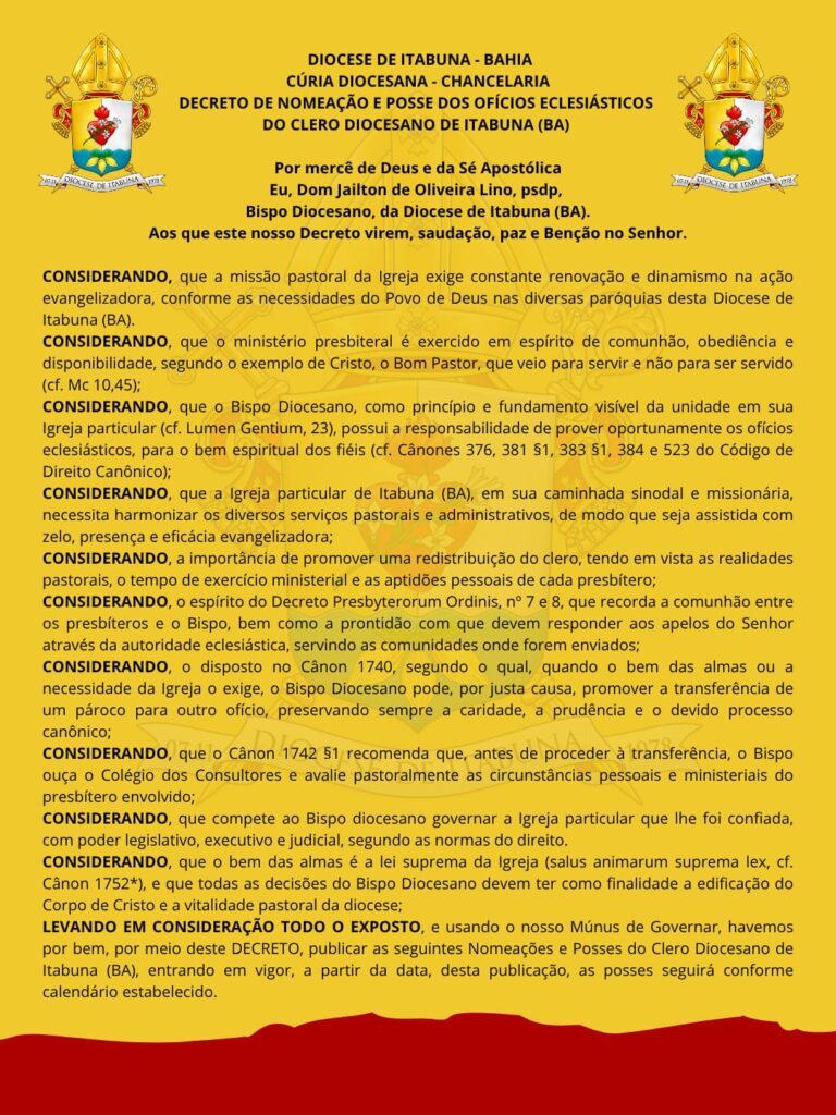 Em um passo significativo para a organização e o fortalecimento de sua ação pastoral, o Bispo Diocesano de Itabuna, Dom Jailton de Oliveira Lino, PSDP, anunciou a nomeação e a posse de 25 sacerdotes em diferentes ofícios e paróquias da Diocese. A decisão foi formalizada através de decreto e visa reestruturar a presença da Igreja Católica na região.